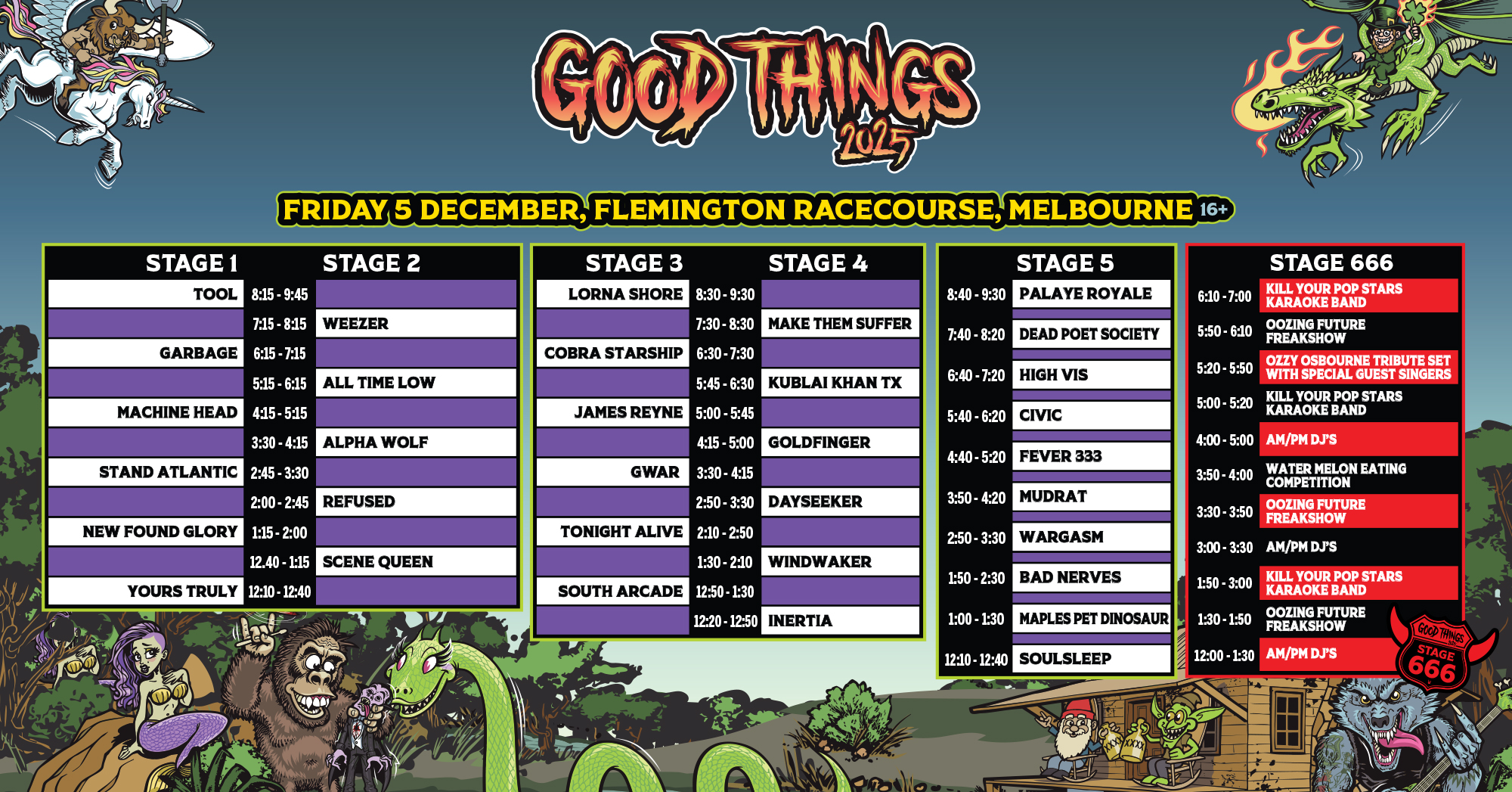 The event has the capacity to be very loud, have high intensity crowd movements, bands that may use profanities in their performance and patrons drinking alcohol. Patrons under the age of 16 will not be admitted as GTF cannot guarantee the health and safety of small children.